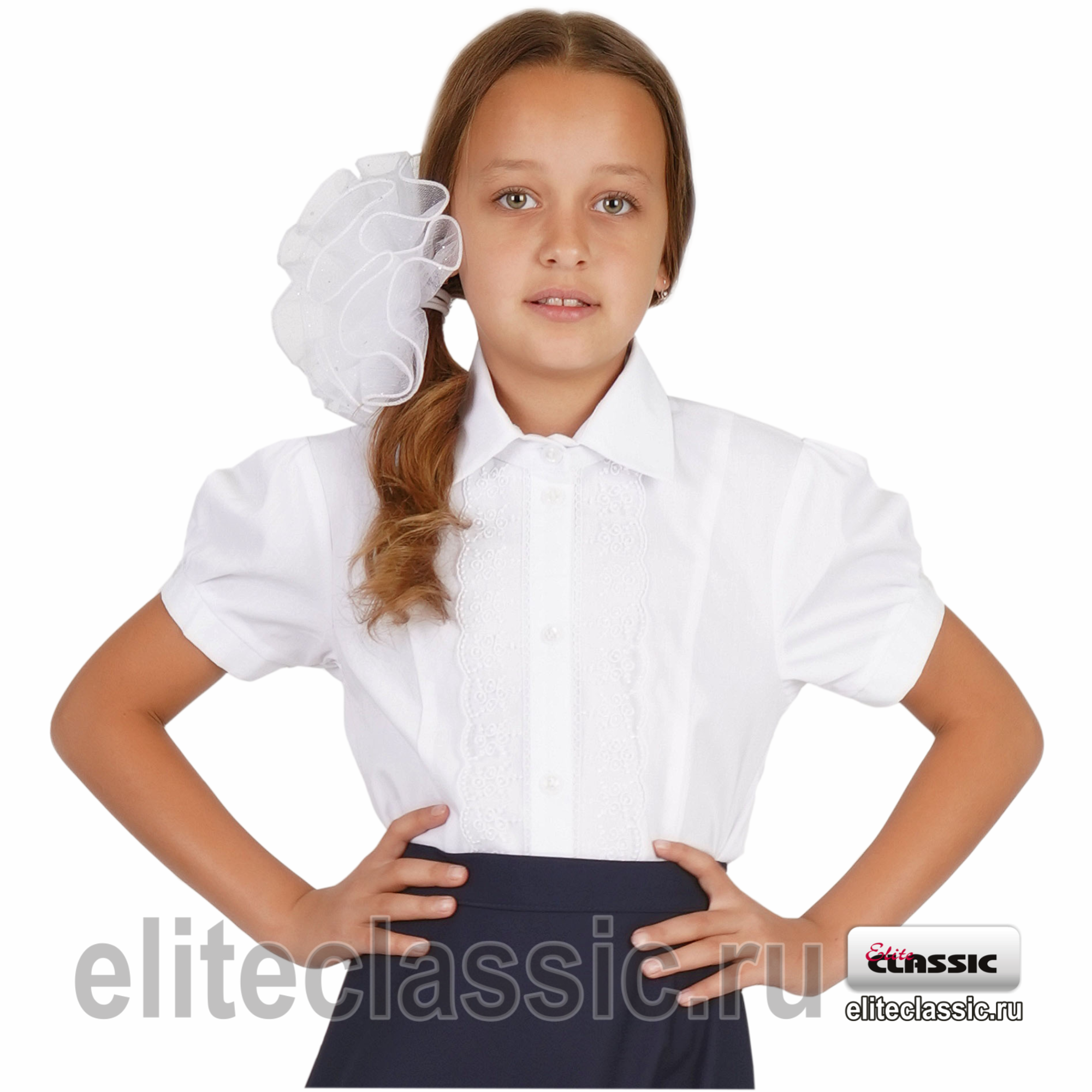 Блузка для школьниц младших и старших классов, прилегающего силуэта с рельефами по переду и спинке из плечевого шва. Воротник отложной. Рукав-фонарик, короткий, втачной, по низу складки, на манжете, манжета застёгивается на одну обмётанную петлю и одну пуговицу. Застёжка центральная на шести обмётанных петлях и шести пуговицах. Акцентом блузки являются объёмные рукав и планка, украшенная кружевом.
