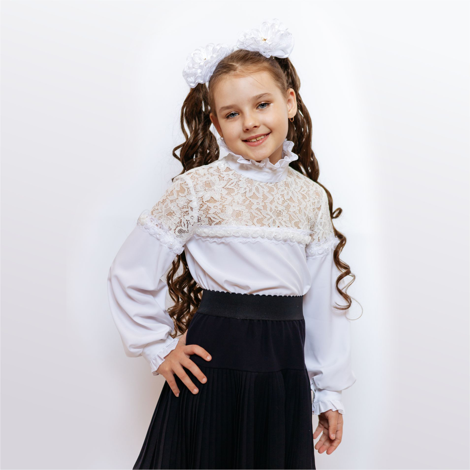 Блузка прямого силуэта для девочек младших классов, с застежкой по спинке. Воротник - стойка из отрезной менжеты с рюшами. Рукав втачной, длинный, со сборкой по низу. Модель украшет гипюровые кокетки, верхняя часть рукавов отделана декоративной тесьмой с розами и жемчугом.