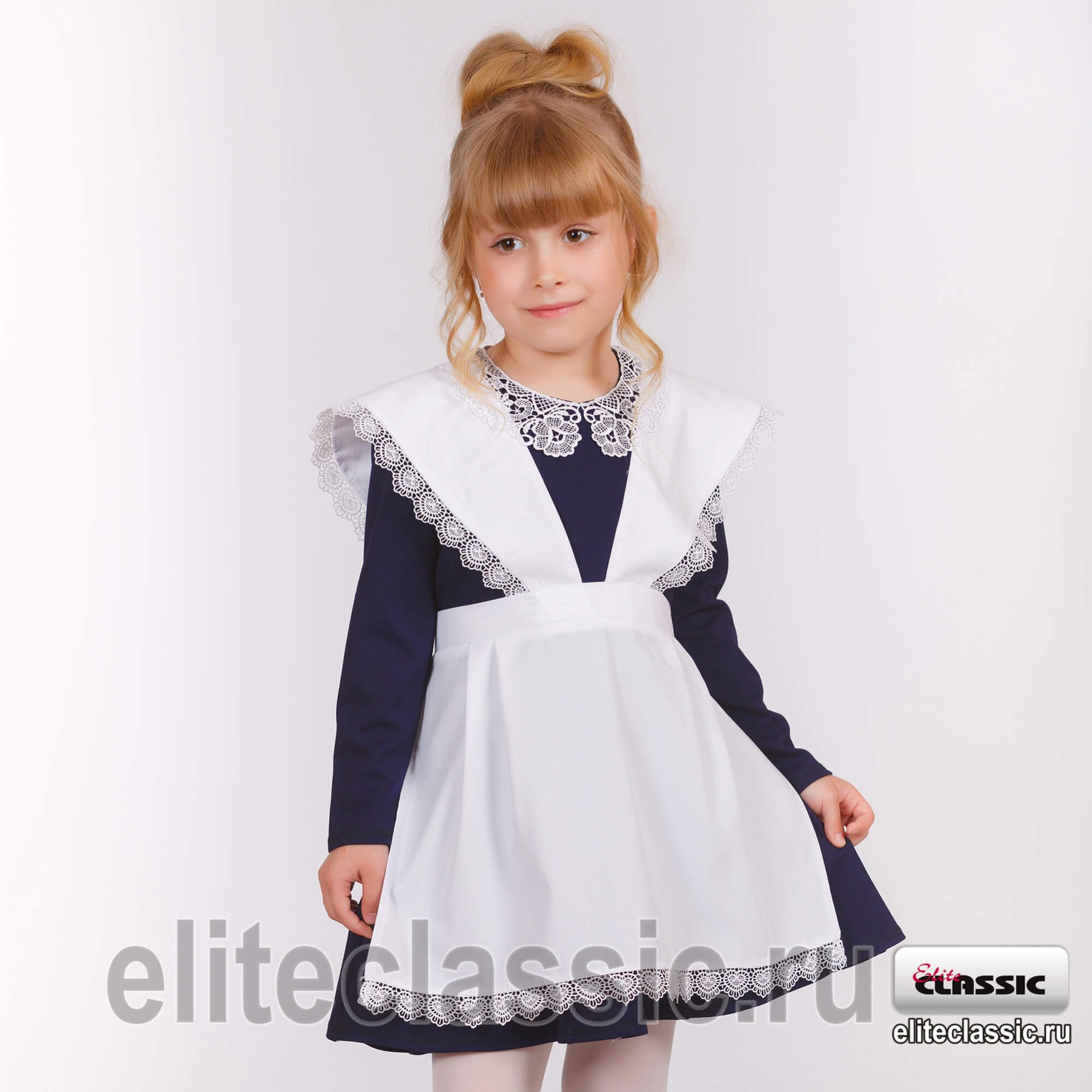 Классический фартук с широкими бретелями от середины переда, по спинке переходящими в воротник на петлю и пуговицу. Пояс отрезной, по талии с группой защипов. По краям бретелей и низу передника декоративное кружево. Отличный вариант не только на последний звонок, но и для повседневной носки.