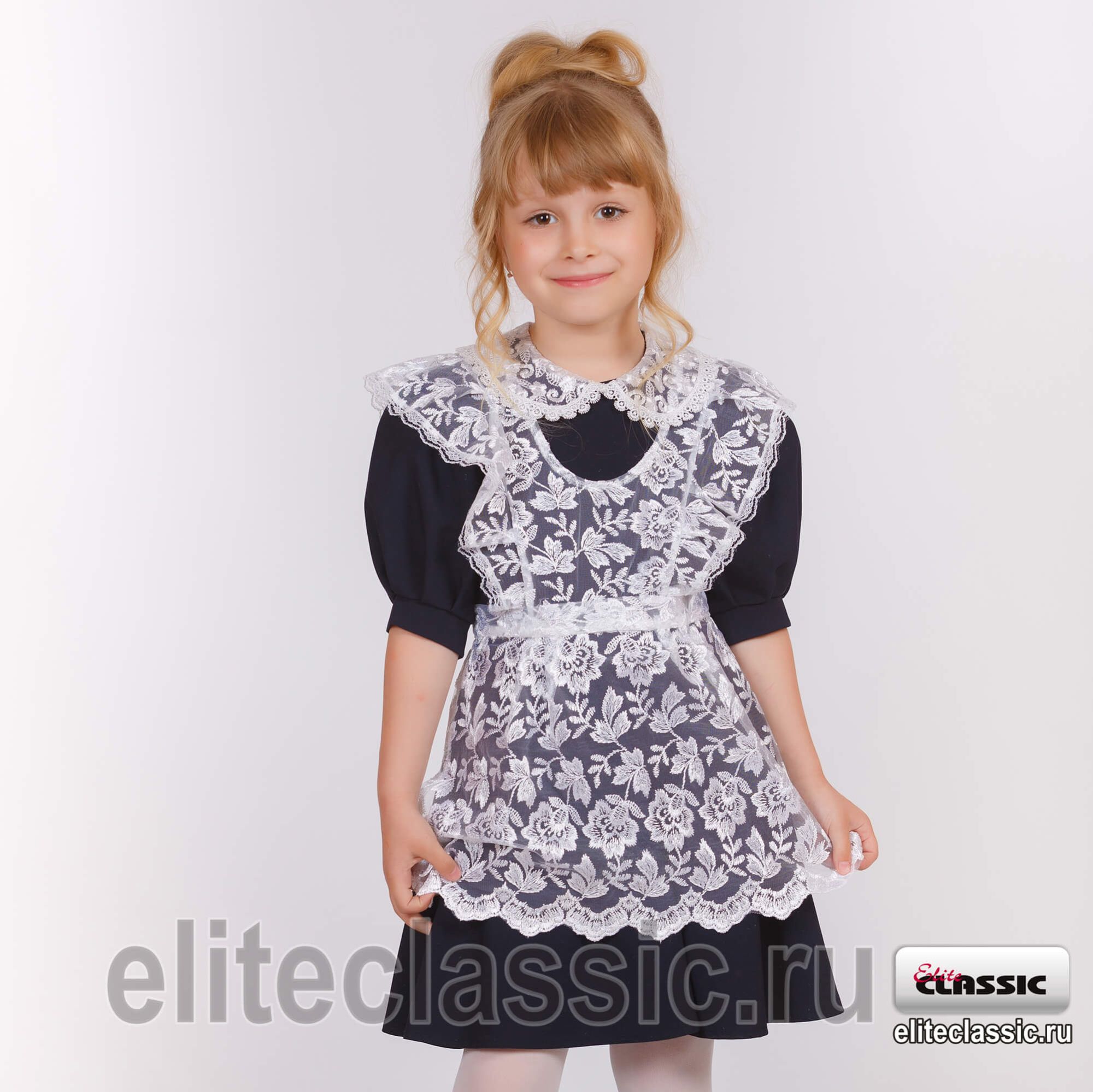 Фартук из кружевного полотна с цельнокроеной грудкой по переду, по спине переходящий в круглый воротник, по кроям с рюшей. Пояс отрезной переходящий в бант. Передник с группой защипов.