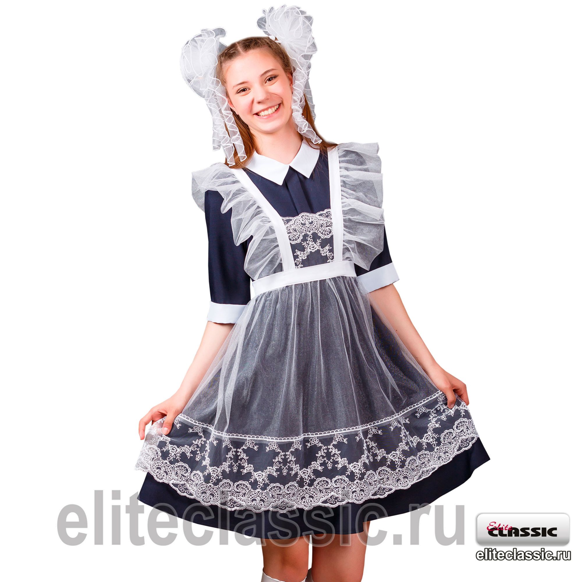 Изящный, воздушный фартук "Шик" из фатина и хлопка с отделкой из широкого кружева для школьниц младших и старших классов. Пояс и брители из хлопка. По брителям оборка из фатина. Низ фартука и грудка из кружева.