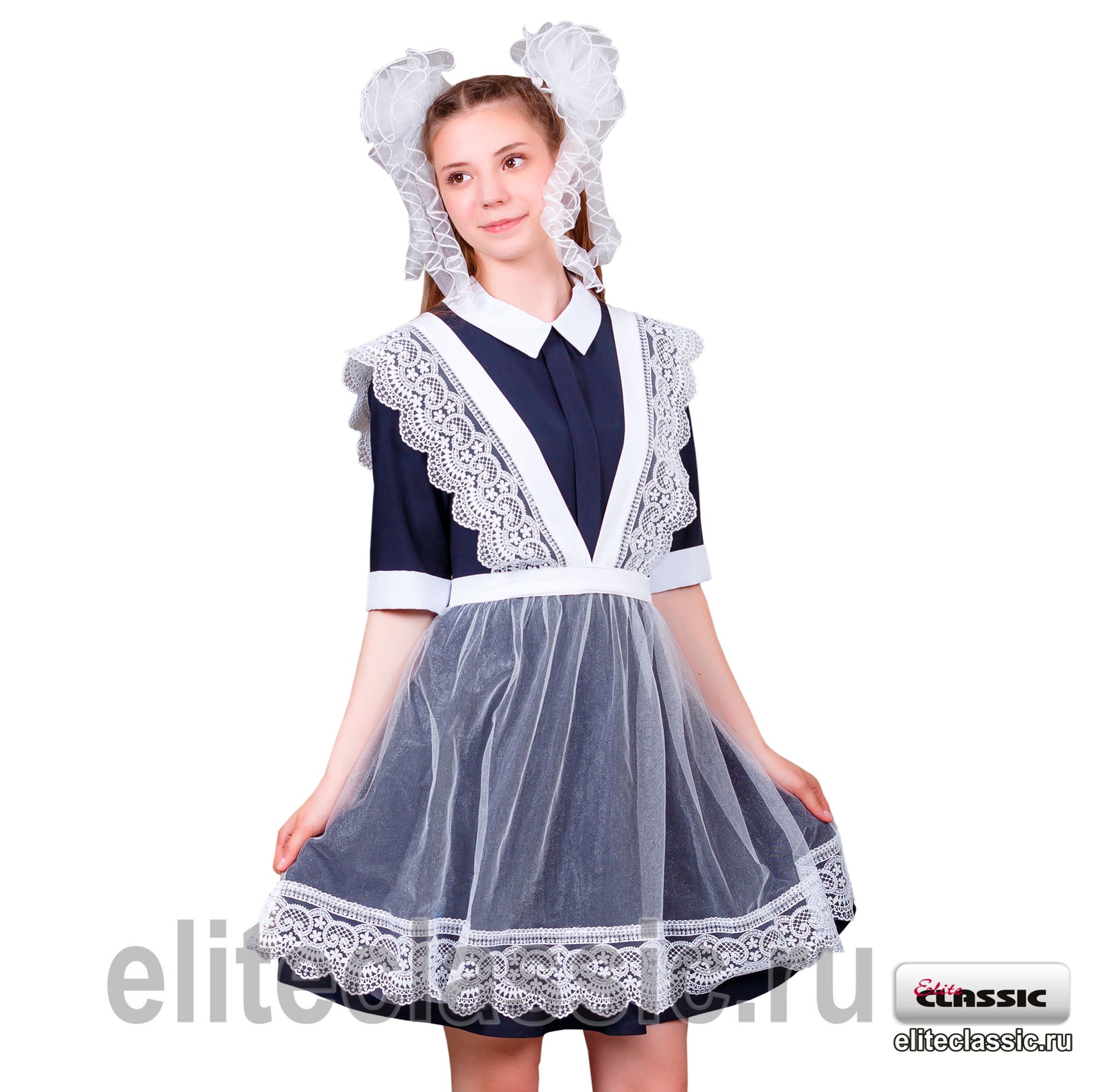 Изящный Фартук без грудки "Снежанна" из фатина с отделкой из кружева для школьниц младших и старших классов. Пояс и брители из хлопка. Брители и низ передника отделанны кружевом.
