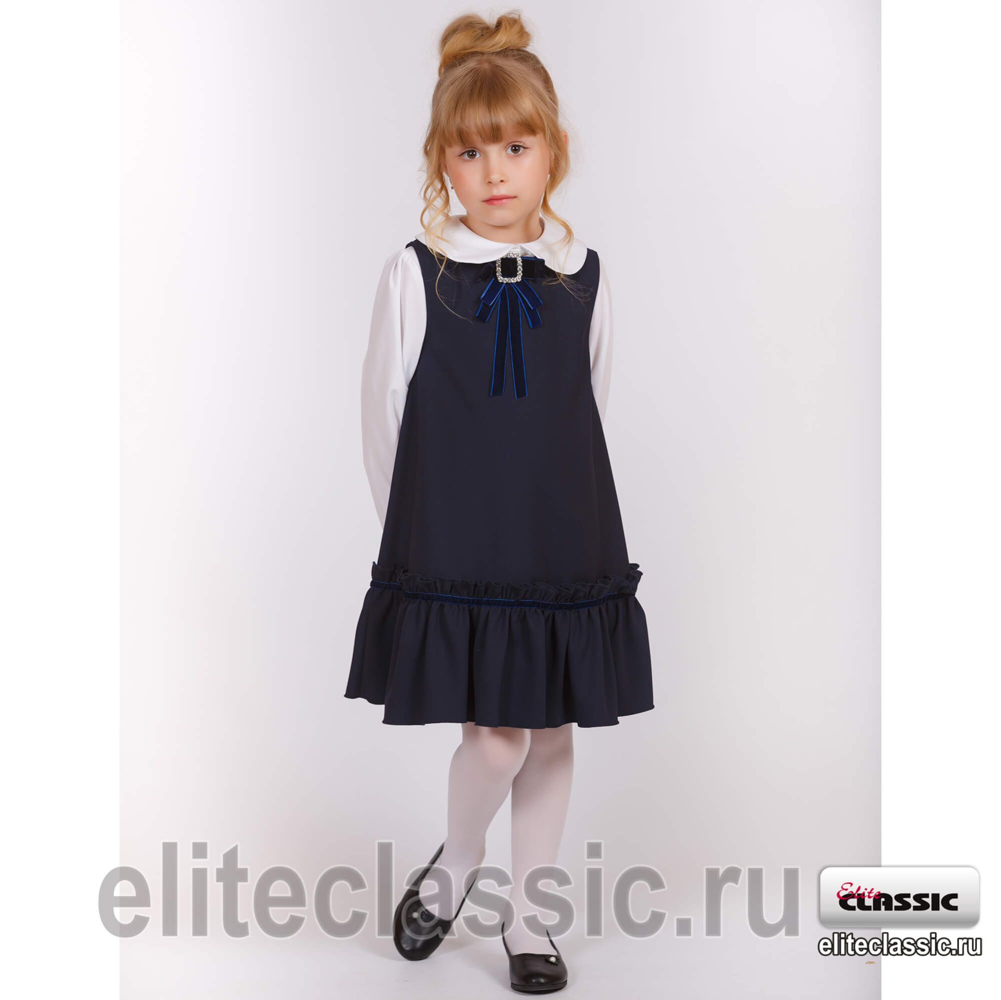 Сарафан А-образного силуэта по низу оборка с настроченной по верху замшевой тесьмой. Вырез горловины округлой формы, по спине застежка «молния». Украшением сарафана является декоративный отстегивающейся бархатный бант-брошь.