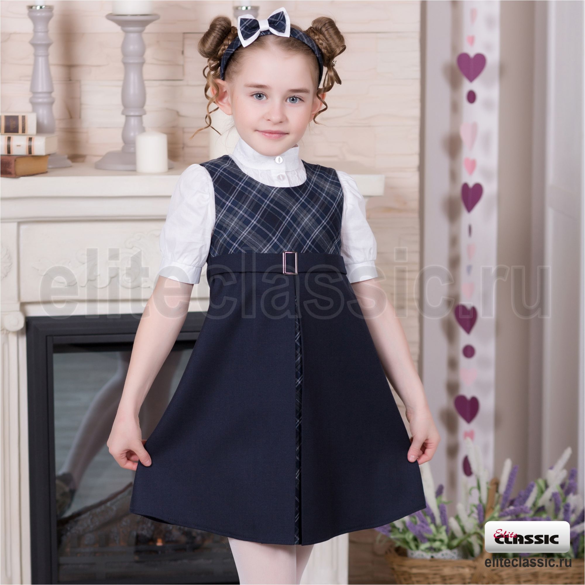 Сарафан отрезной выше линии талии, с незначительным расширением к низу. По переду со встречной складкой и декоративным поясом с пряжкой. Лиф переда и вставка складки из ткани в клетку, что придает модели интересный вид.