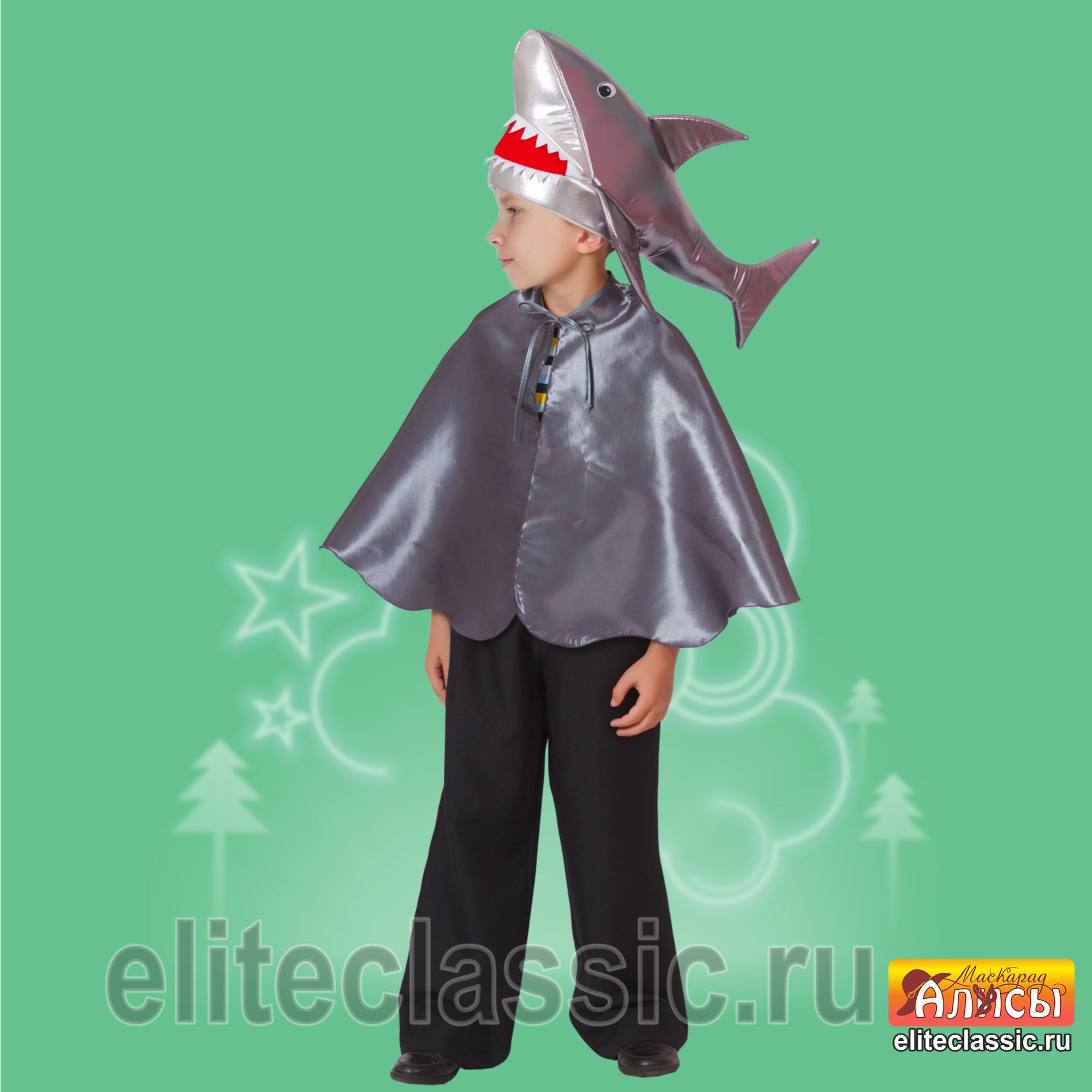 Костюм акулы детский на Новый год или театрализованное представление. Костюм представляет из себя шапочку в виде туловища с головой акулы, с открытой пастью и накидку с имитацией плавника акулы на спинке. Костюм подойдет для ребенка с ростом от 120 до 140 см. Предоставьте ребенку возможность удивить гостей новогоднего праздника эффектным и зрелищным нарядом!