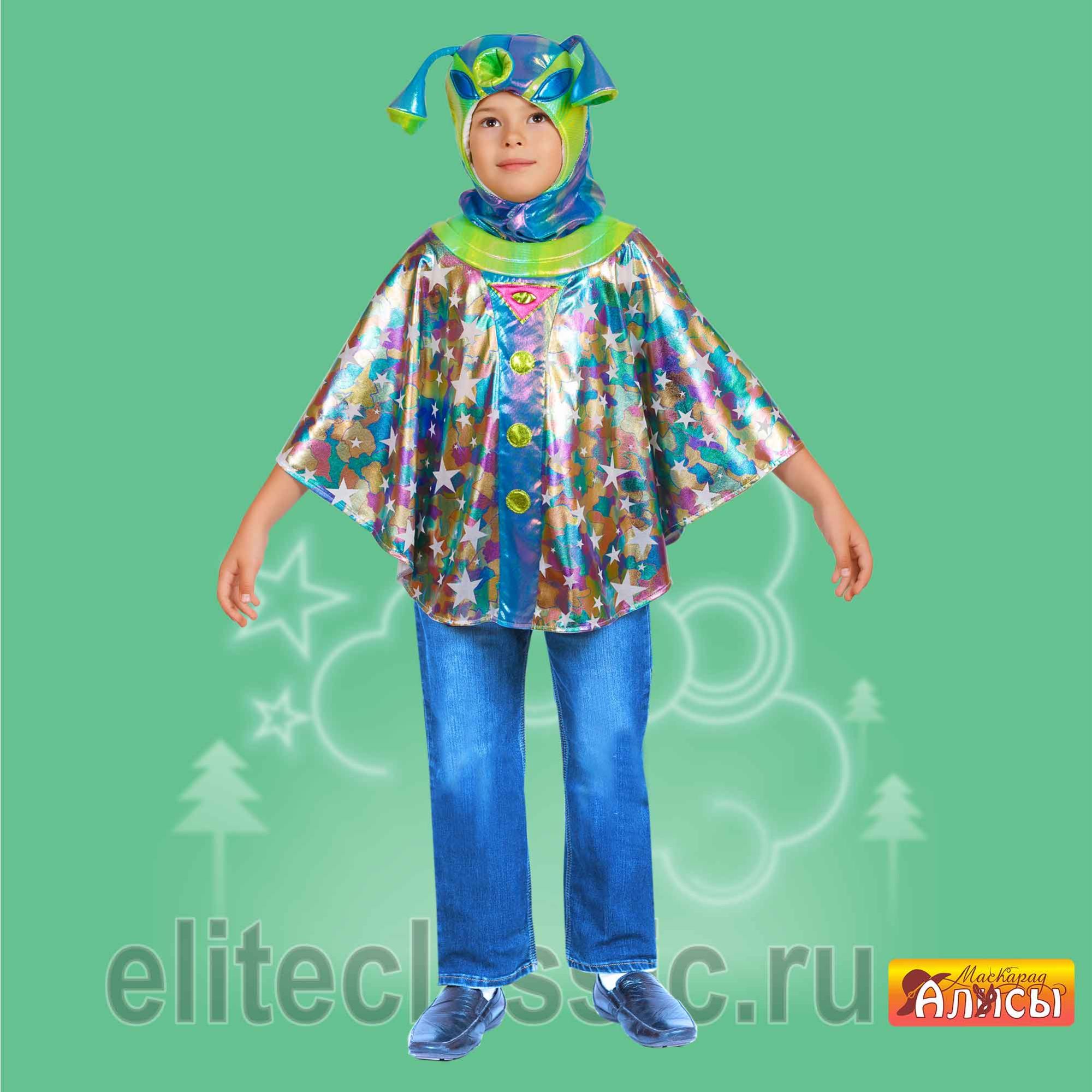Накидка и капор выполненный в форме головы инопланетянина с рожками носом. Накидка свободной формы позволяет не привязывать изделие к размеру ребенка. Костюм предназначен для детей младшей возрастной группы.