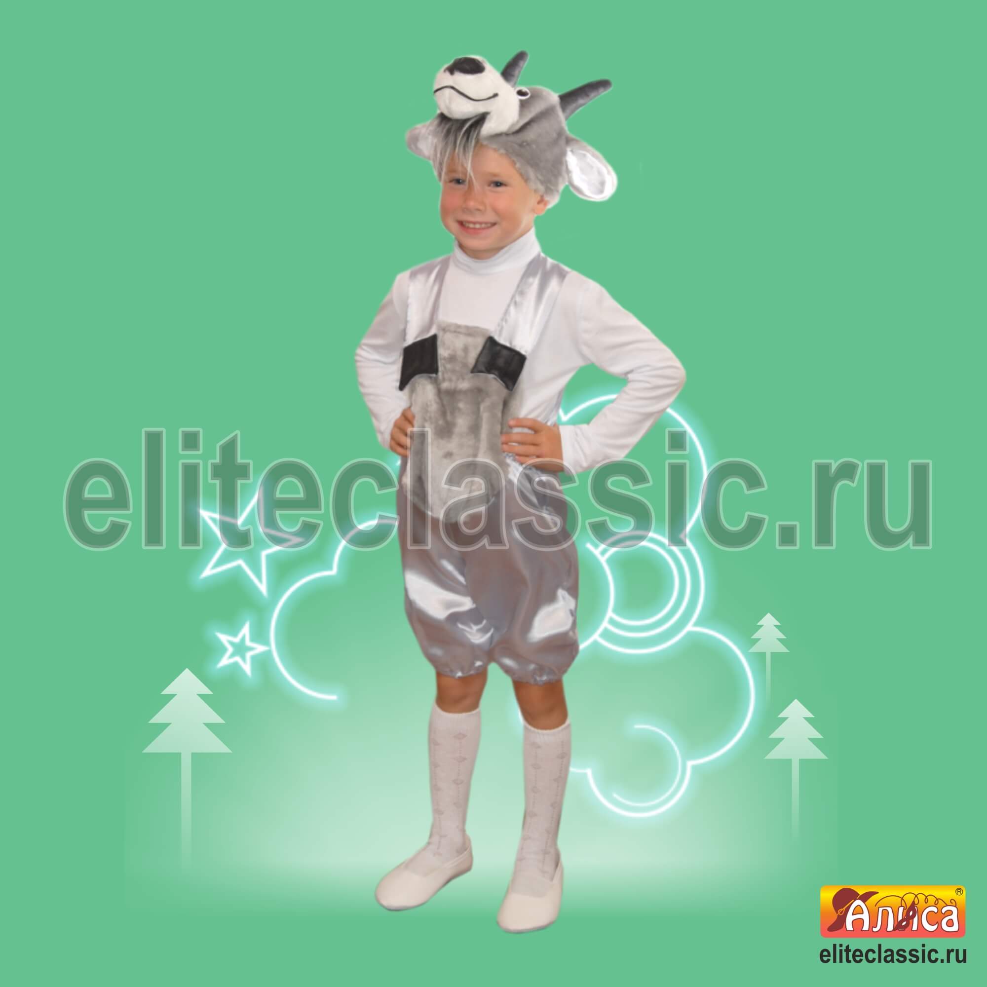 белый или серый комбинезон и маска в виде морды козлика.