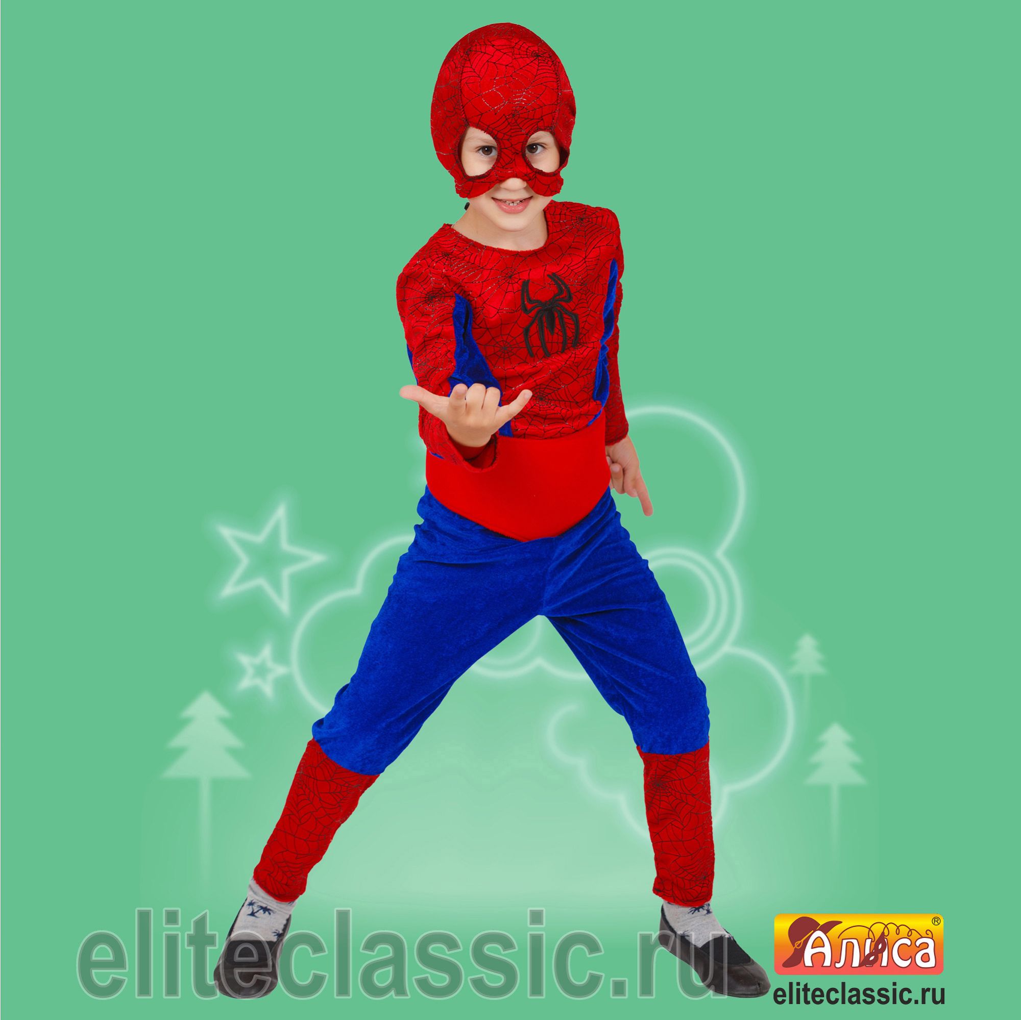 Образ Человека-паука. Костюм выполнен из темно-синего велюра с красными вставками паутиной. На груди эмблема чёрный паук. Подойдет для театральных постановок, новогодних и детских утренников.