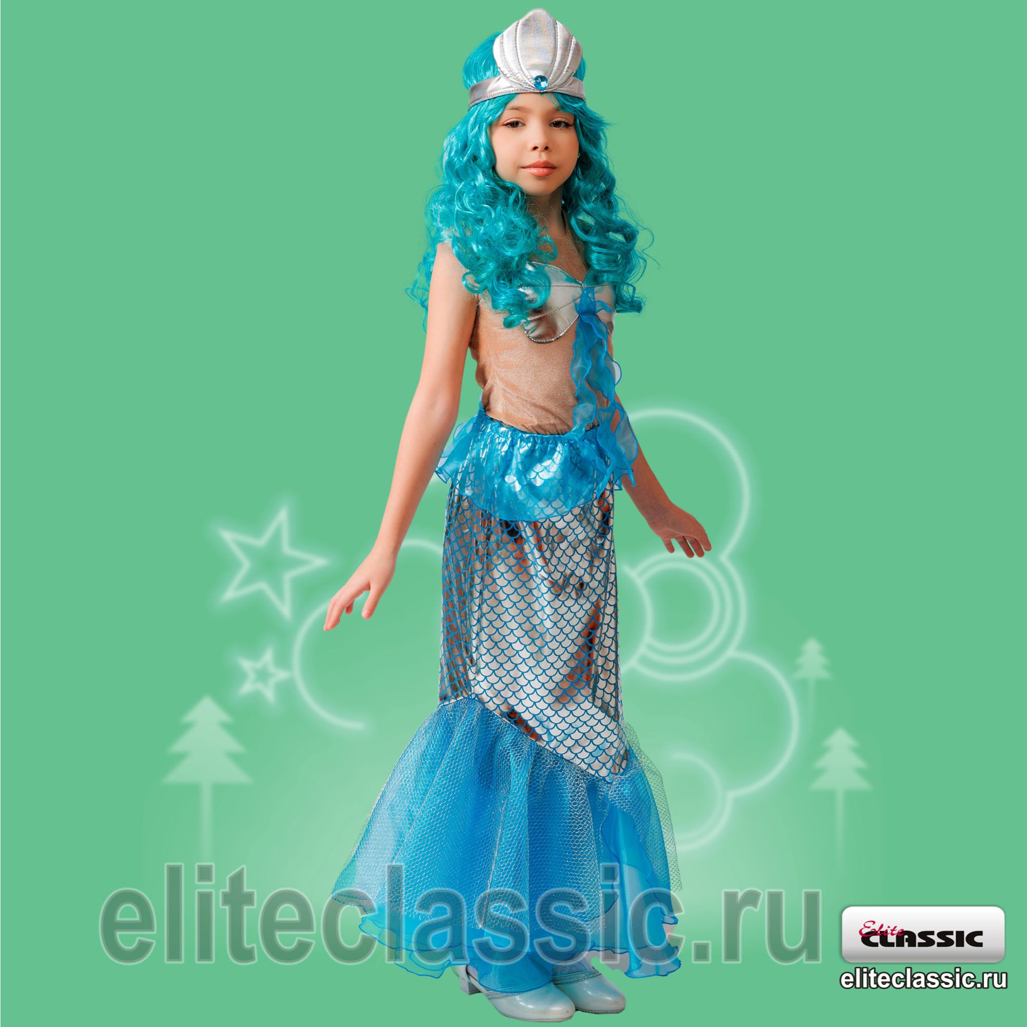 корона-ракушка, бирюзовый парик, блуза и юбка в форме рыбьего хвоста.