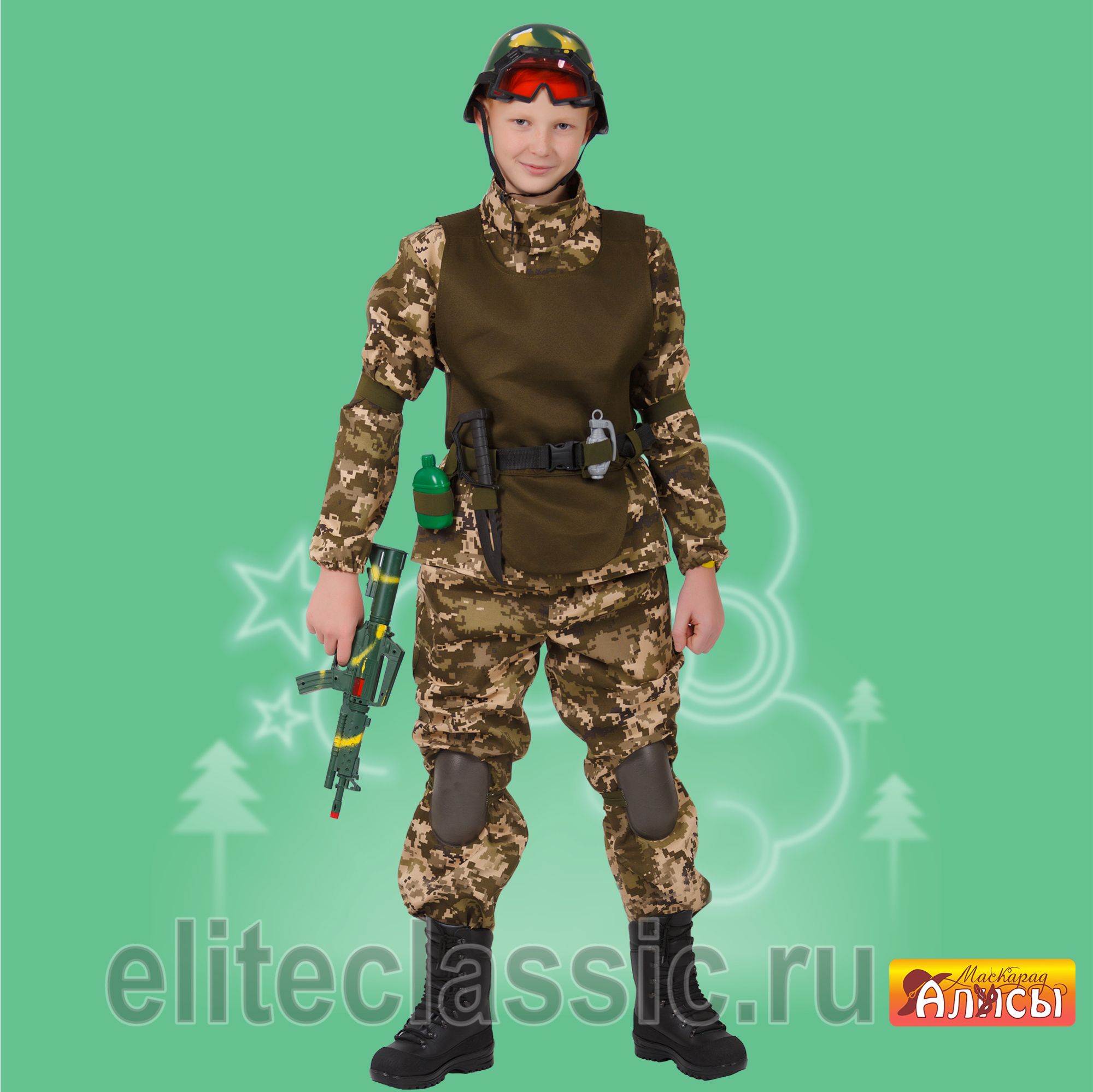 Военный костюм Спецназ выполнен из камуфляжной ткани. Куртка прямого силуэта, застёгивается впереди на липучку. Рукав втачной длинный, низ собран на резинку. Воротник-стойка. Брюки свободные, прямые. Жилет сзади застёгивается на липучки. Костюм не сковывает движения. Для защиты колен и локтей используются наколенники и налокотники. Граната, нож, рация, фляжка и автомат, позволят полностью погрузиться в роль спецназа. Свободная форма одежды не сковывает движения. Прекрасно подойдёт для военно-патриотических праздников, 23-го февраля, 9-го мая, сценических и театральных постановок.