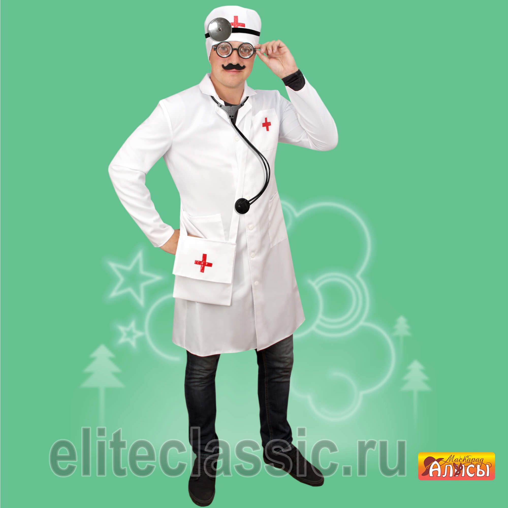 халат, колпак, стетоскоп, очки, усы, сумка.
