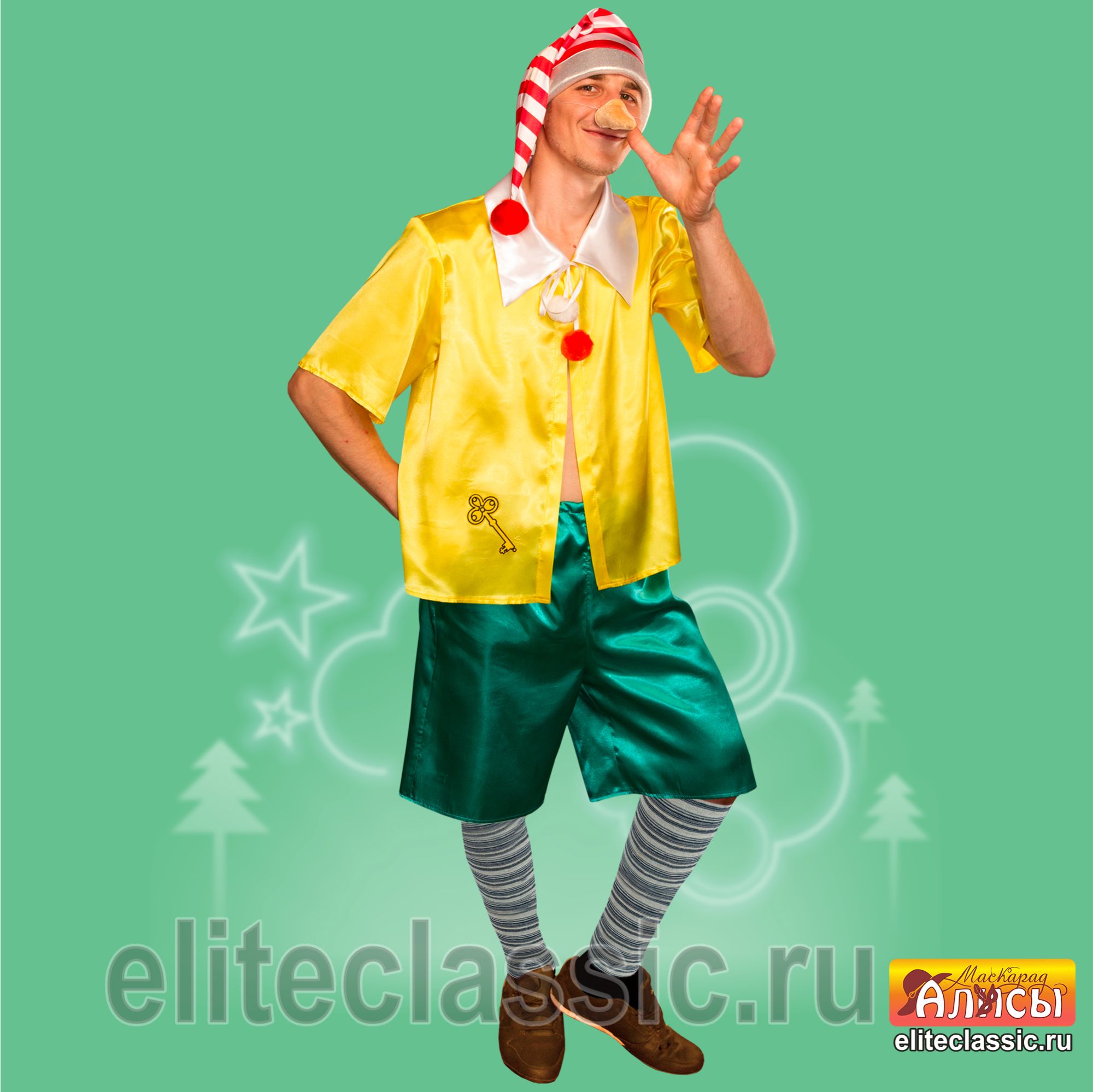 колпак, рубаха, шорты, нос и гетры.