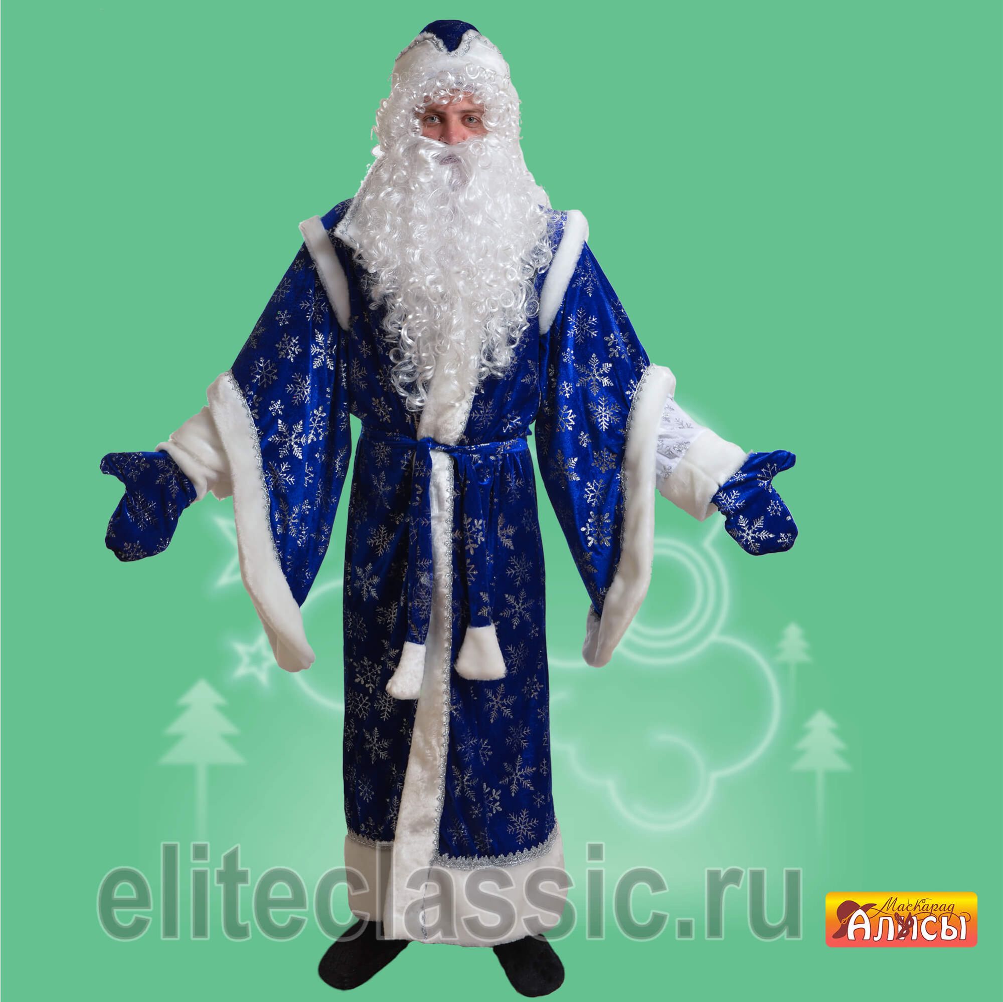 велюровая шуба с боярскими рукавами, украшенная россыпью серебристых снежинок, шапка, варежки, пояс, красивая кудрявая борода и парик.