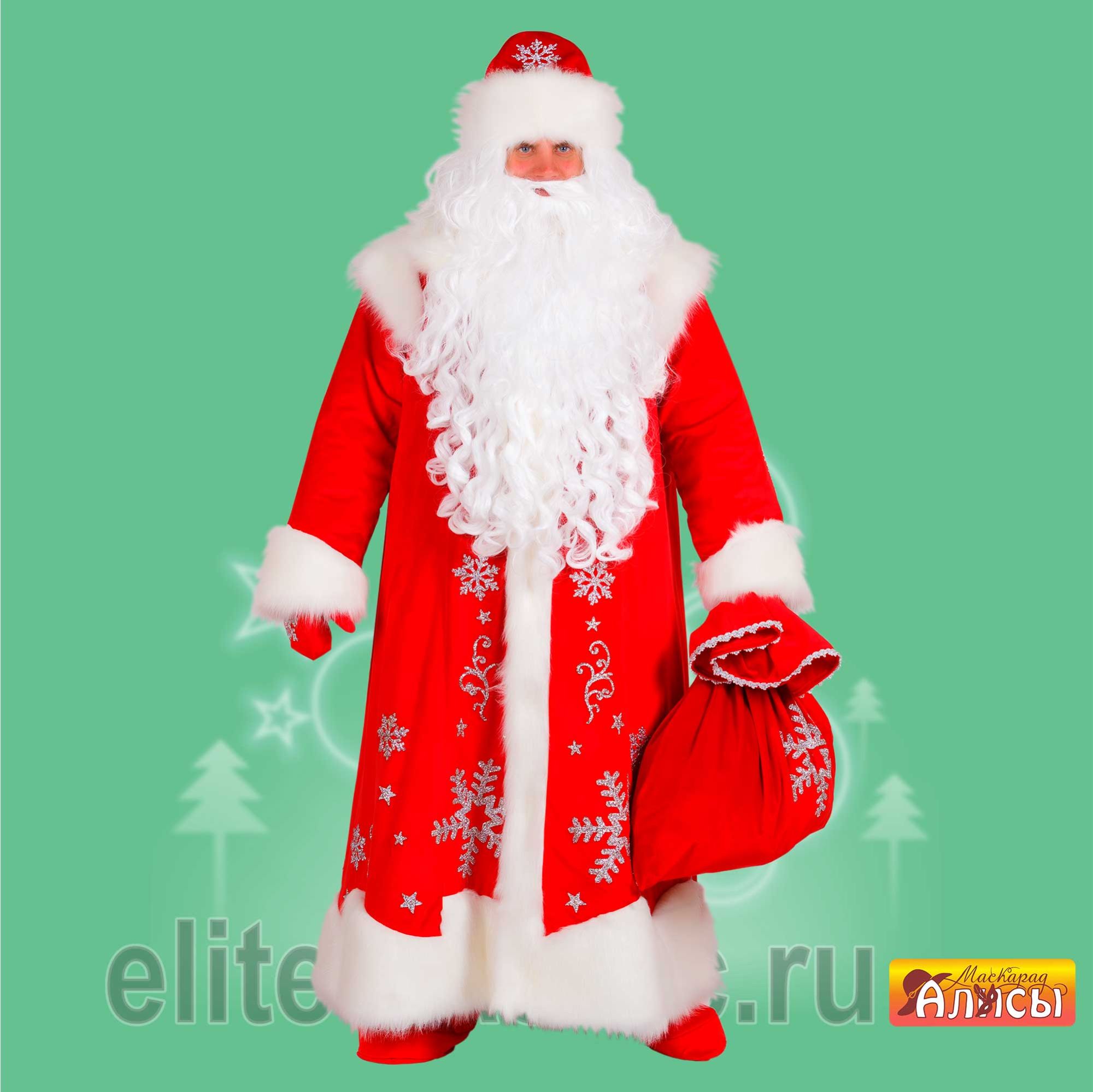 Бархатная шуба украшенная апликациями, головной убор, парик, борода, варежки, мешок.