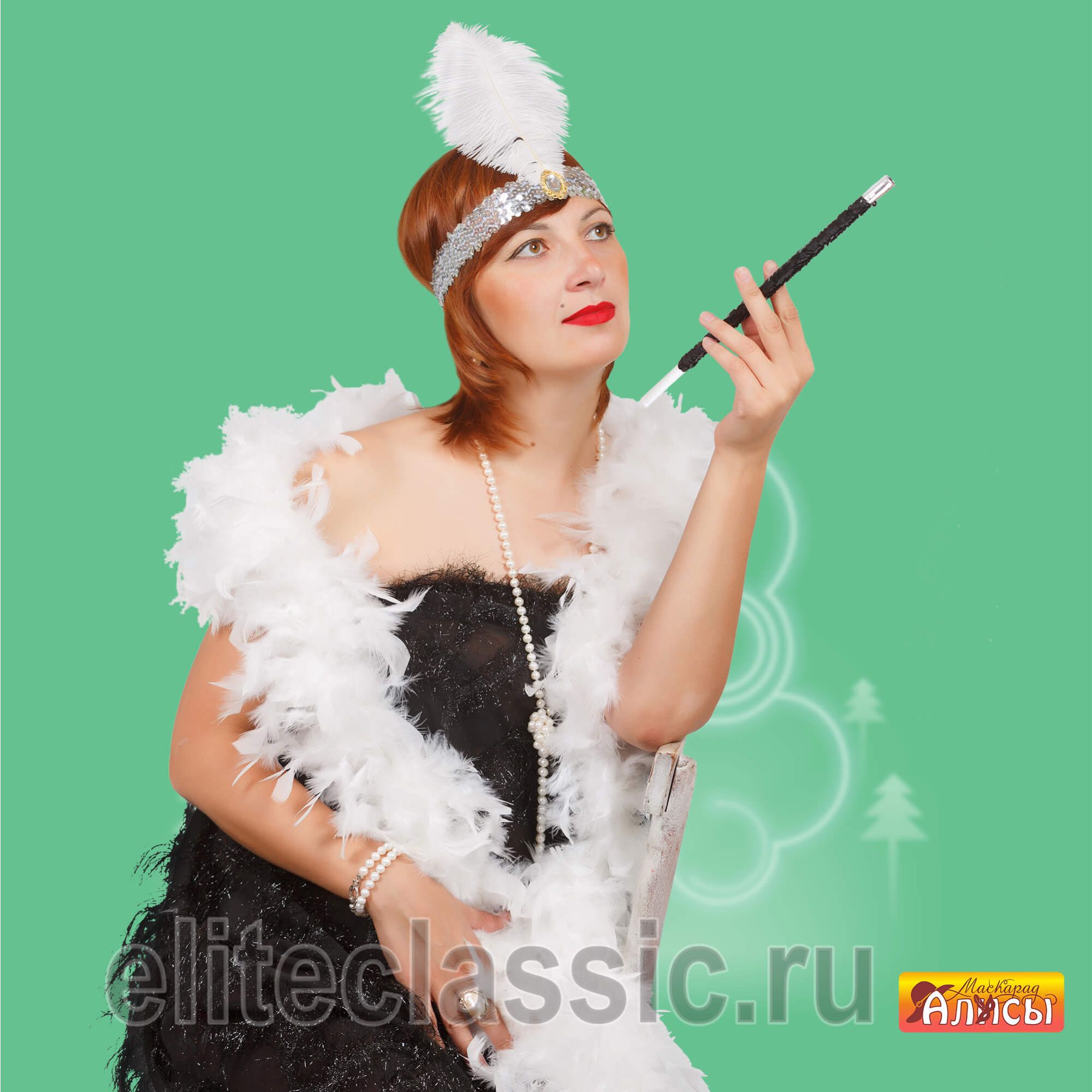повязка с пером (цвет повязки с пером в ассортименте), мундштук, боа.