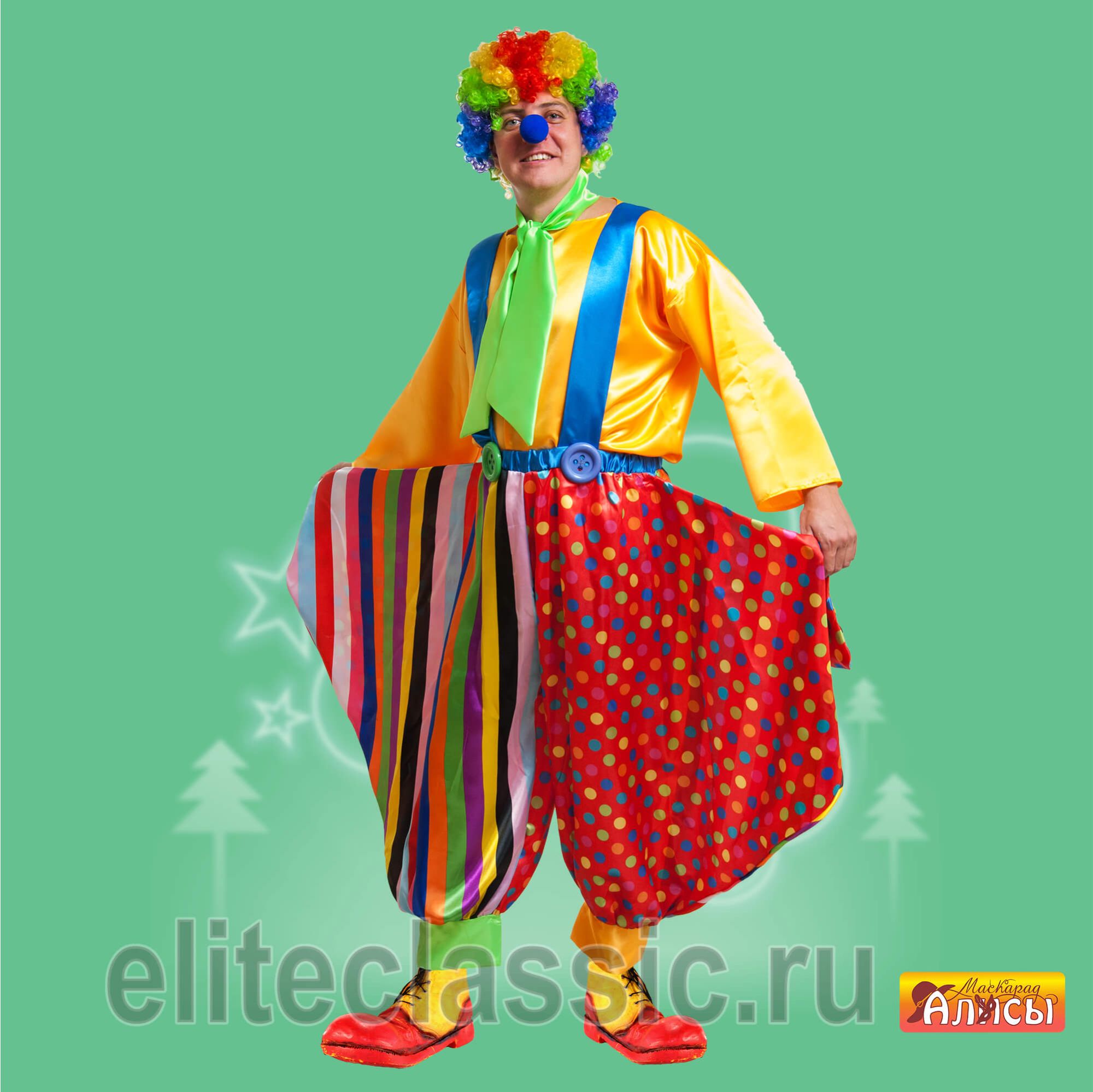 яркий разноцветный комбинезон, рубаха, галстук, образ дополняют нос в ассортименте жёлтого, красного или синего цвета и парик.