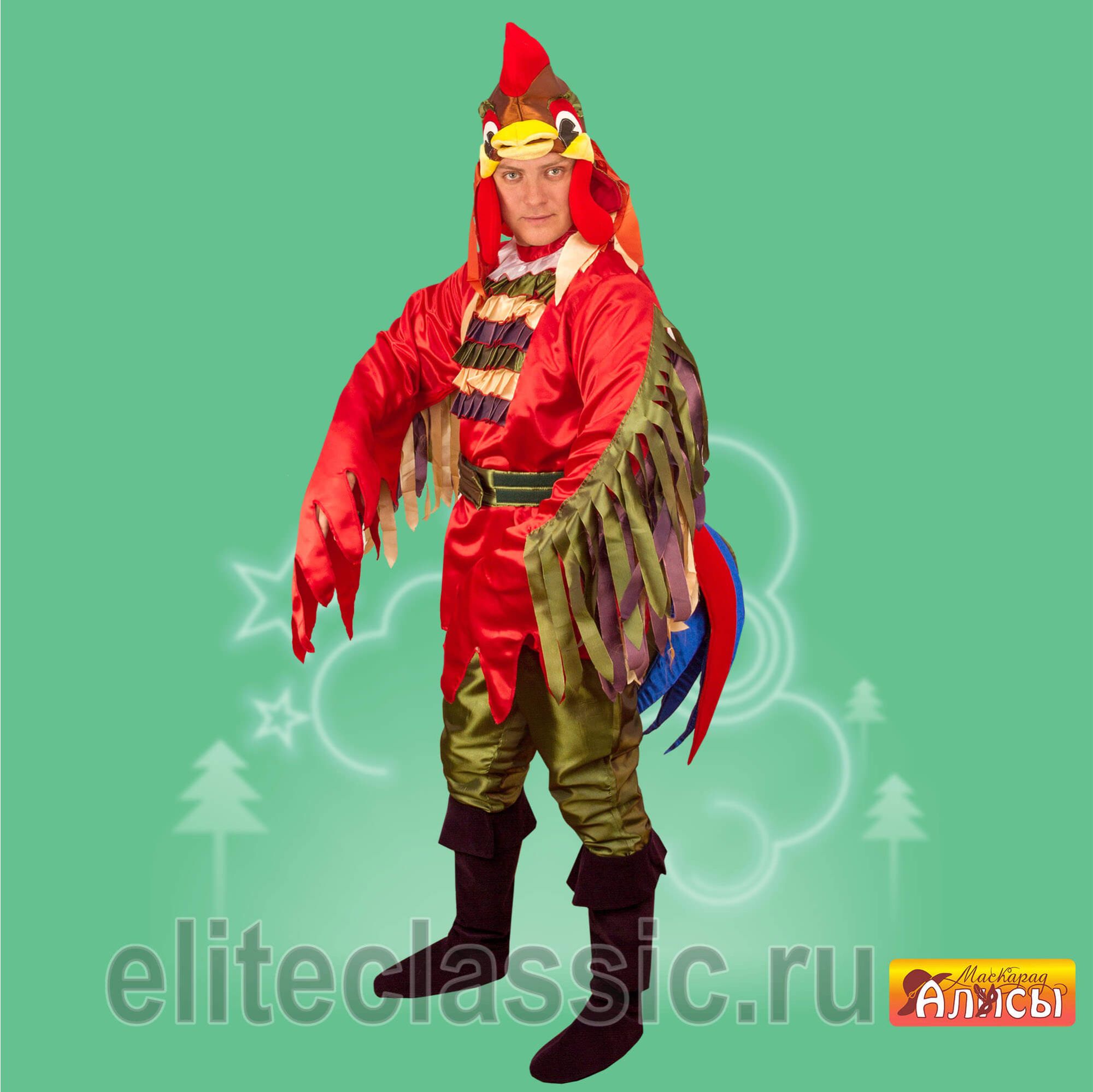 маска в виде петуха, рубашка, хвост, штаны, сапоги.