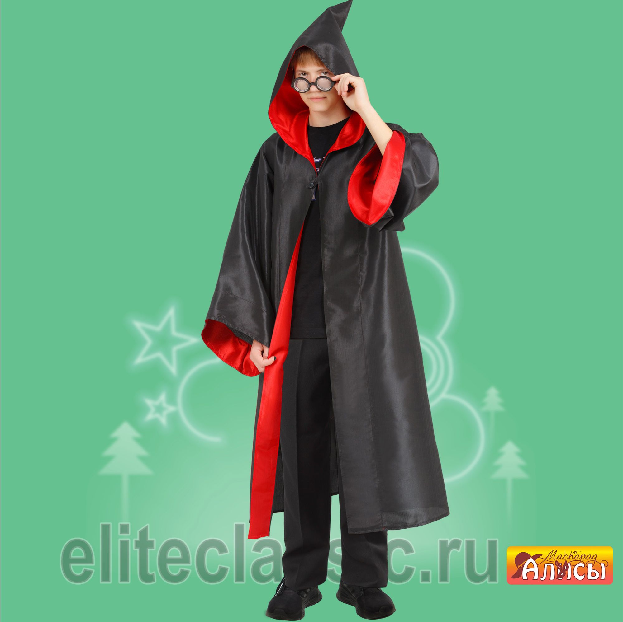 очки, халат с капюшоном.