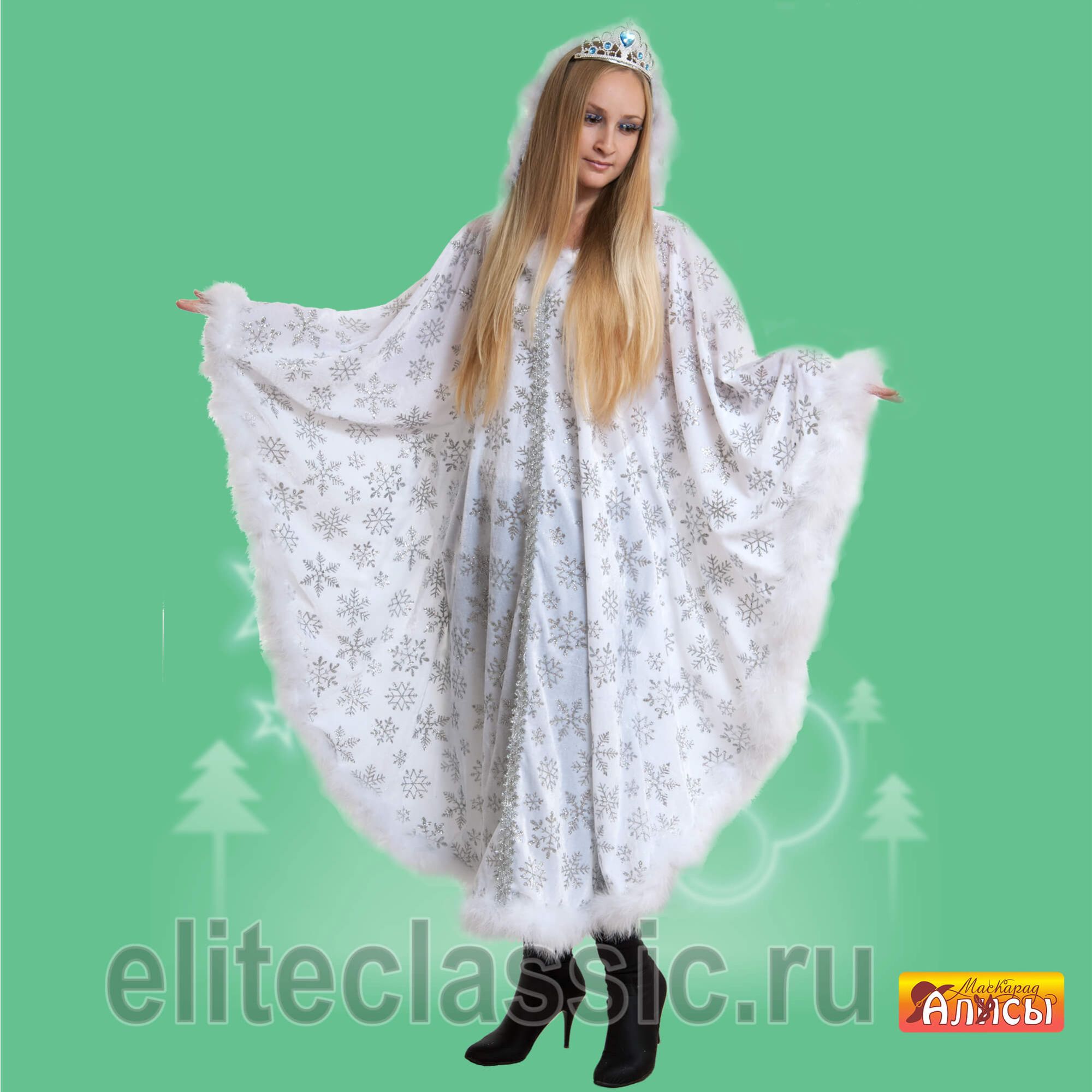Карнавальный костюм "Зимушка Зима". Наряд подойдет для празднования Нового года, театральных постановок и костюмированных праздников. Удлиненная шубка-пончо, из качественного белого велюра, украшенна россыпью серебристых снежинок и отороченная белым мехом. Голову можно украсить Короной (в комплект не входит).
