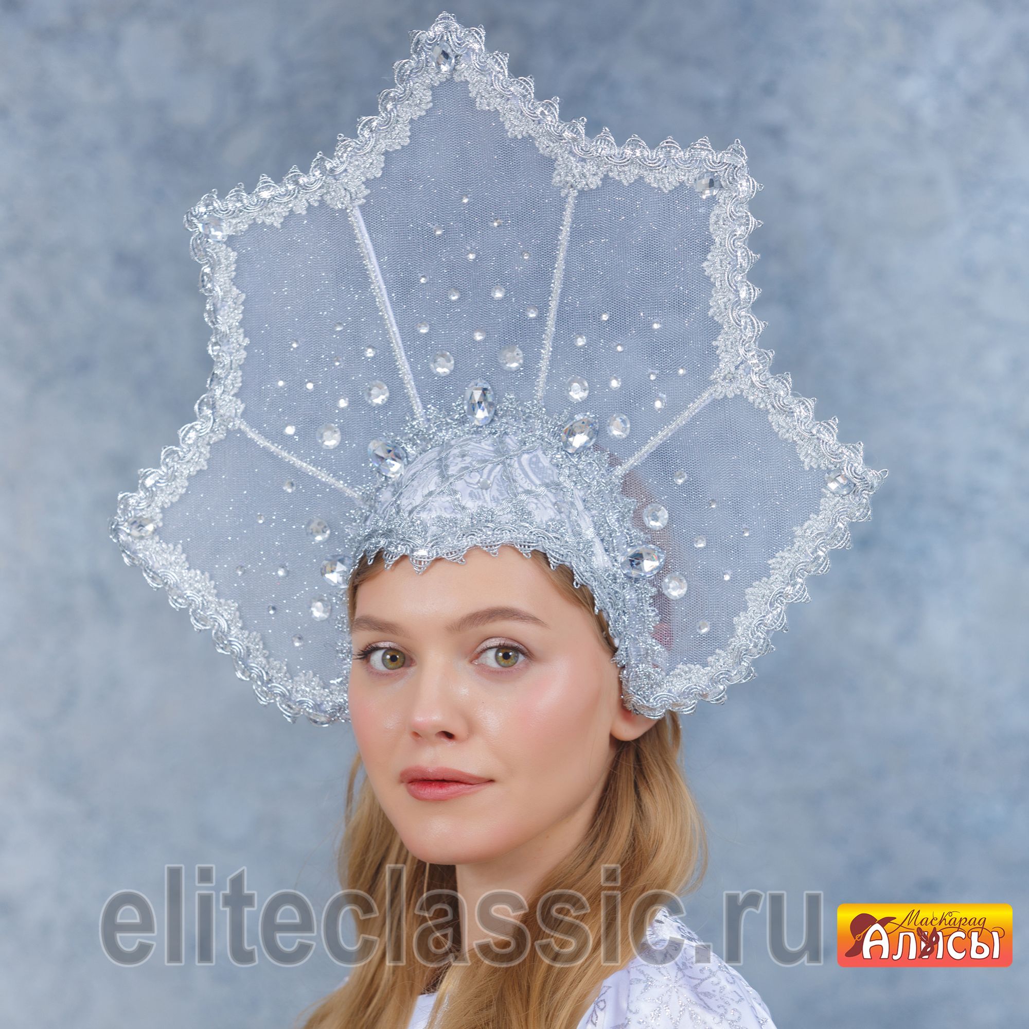Он подойдёт к любому праздничному наряду, порадует яркими переливами инкрустации белых льдинок из камней-самоцветов, создает запоминающийся и эффектный образ. Отлично сочетается с различными нарядами. Станет отличным аксессуаром для фото-сессий, тематической вечеринке, на любом празднике, на любой сцене.Головной убор можно использовать для приветствия гостей, как сувенир для подарка, подойдет для проводов зимы, празднования Нового года, театральных постановок и костюмированных праздников.